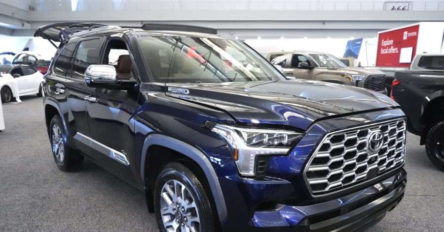 A 2025 Toyota Sequoia 4WD Hybrid on display at the Pittsburgh International Auto Show in Pittsburgh, Feb. 14, 2025. (AP Photo/Gene J. Puskar)