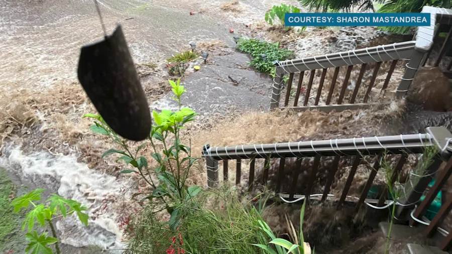 “This is not a river that was here before,” Mastandrea said pointing to a deep gulch filled with boulders running the length of their green lawn. “It’s never been here before. And it just came down and and hit trees and was redirected through a property next to us and then slammed right into our house.”