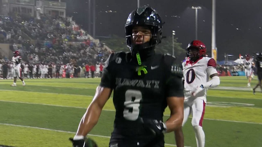 Micah Alejado connected with Jackson Harris on a 9 yard touchdown reception to give the ‘Bows a lead. Which the drive was fueled by an unsportsmanlike penalty by the Aztecs on 3rd and long, giving UH a spark of life and the ‘Bows made the most of it.