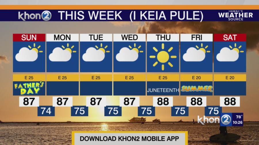 HONOLULU (KHON2) – Strong stability prevails and is characterized by a stout trade wind inversion that slopes slightly downward from around 7kft at Kauai to 6kft at Hilo.