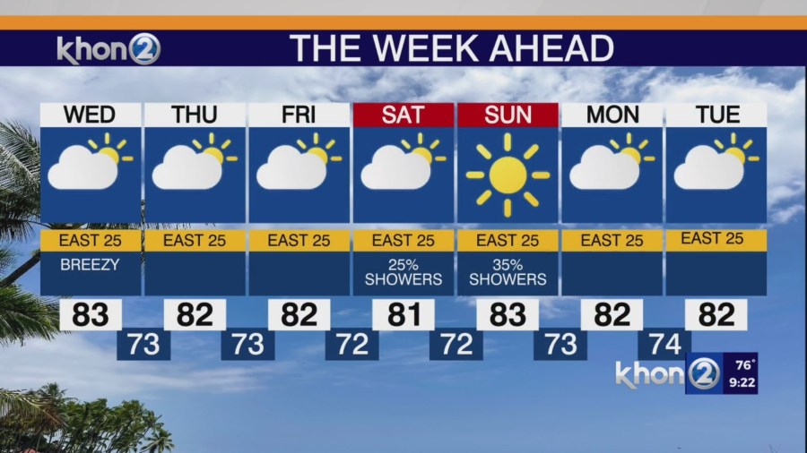 Low-pressure is situated about 775 miles west-northwest of Kauai, while a high-pressure system is centered roughly 1550 miles northeast of Honolulu. Breezy trade winds are blowing across the islands, with the strongest winds over the eastern part of the state.