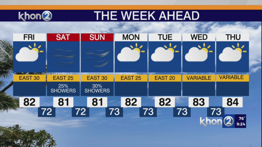 HONOLULU (KHON2) — A high-pressure system far northeast of the state will bring breezy to locally windy trade winds through the rest of the week. Showers will primarily affect windward areas, becoming more common at night. An upper-level low will move over the islands from Friday into early next week, leading to periods of increased trade showers in both coverage and intensity.