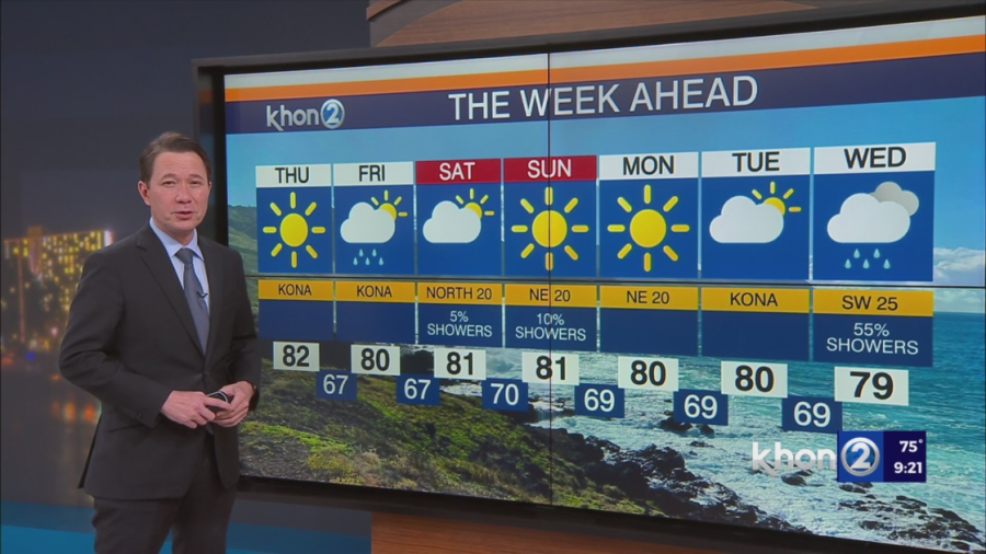 HONOLULU (KHON2) — A cold front is expected to pass north of the islands Thursday and Friday. Kona winds are expected to replace the trade winds and usher in showers during this time period. Although most of the heavy rain will remain north, some heavy showers are possible Thursday and Friday afternoon. Trade winds and drier conditions will return to the state this weekend.