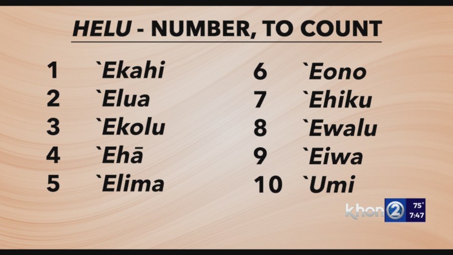 ‘ekahi, ‘elua, ‘ekolu, ‘eha, ‘elima, ‘eono, ‘ehiku, ʻewalu, ‘eiwa, ‘umi.
