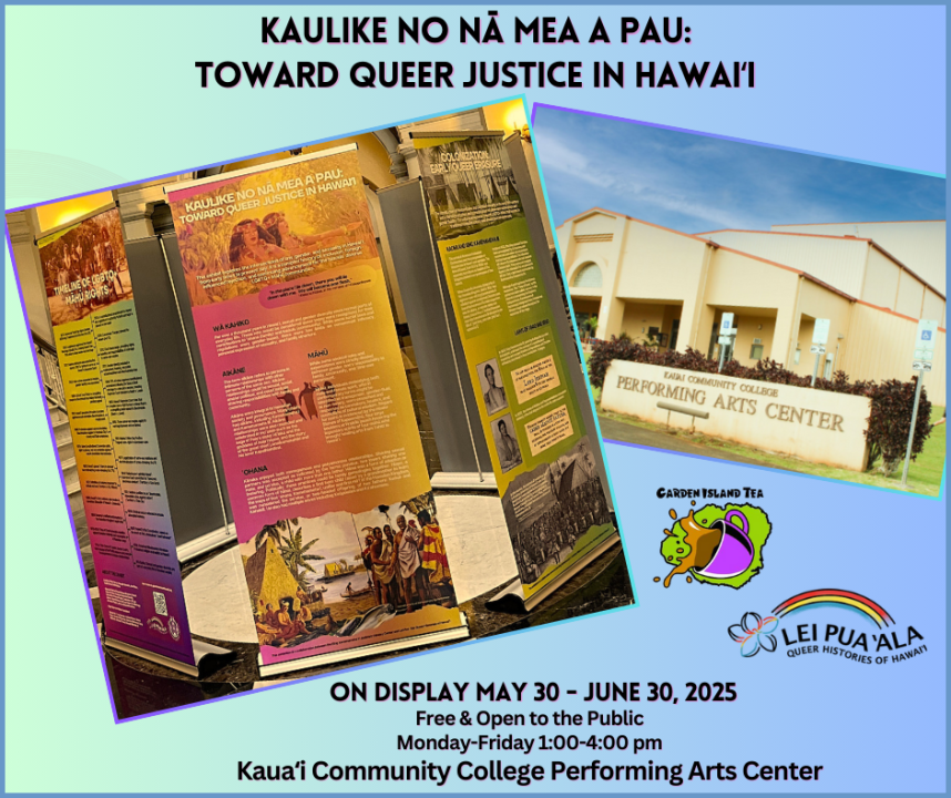 Kaulike No Nā Mea A Pau: Toward Queer Justice in Hawaiʻi will open on May 30 at the Performing Arts Center at Kauaʻi Community College and remain on display throughout the month of June. It’s part of celebrating Pride Month by uplifting the lives and legacies of Hawaiʻi’s LGBTQ+ communities.