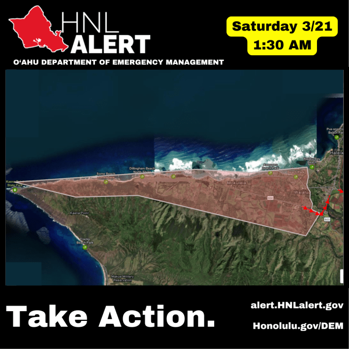 On Saturday, March 21, at 2:13 a.m., an HNL Alert from the Oahu Department of Emergency Management provided an evacuation update for the North Shore.