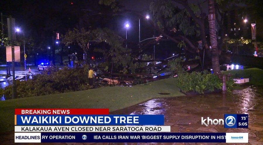 A large tree that fell overnight along Kalakaua Avenue left visible damage Friday morning as cleanup crews worked to clear debris and reopen the busy tourist corridor.