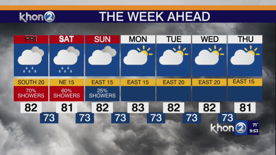 HONOLULU (KHON2) — A Kona low northwest of the Hawaiian Islands will continue to bring periods of moderate to heavy showers to the central and western islands through at least Friday. A large band of heavy showers currently over Oahu, with rainfall rates around 1 inch per hour. Over the past 24 hours, Oahu has received 8 to 10 inches of rain in some areas. A Flood Watch is in effect for the western and central islands through Friday.