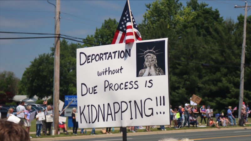 “I’m sure that caring and thoughtful people didn’t vote for this abuse of power, cruelty and corruption,” said Becky Palmer, a leader with Indivisible Greater Grand Rapids, which hosted the protest. “So we’re gathering to remind Trump and his enablers that America has no king.”