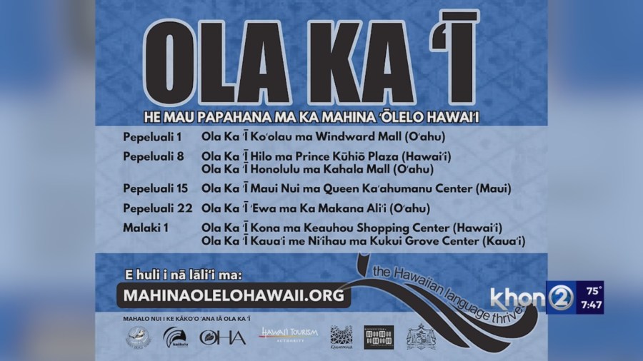 HONOLULU (KHON2) – O keia la ka la hope loa o ka mahina Ianuali. I ka la apopo, ka la mua o ka mahina Pepeluali o ia hoi ka Mahina ʻOlelo Hawaiʻi. I keia hopena pule, ma anei ma Windward Mall, he hanana no ka hoolaulea o Ola Ka I. Ae? A oia!