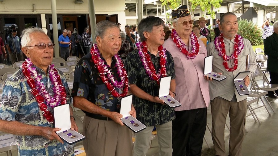 The families of five Nisei soldiers were presented Purple Heart medals for their loved ones who died in 1945 during a ceremony at Pearl Harbor.