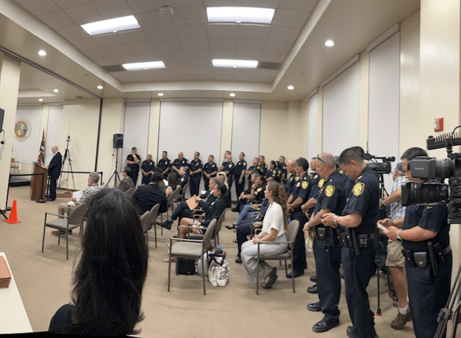 The council meeting at Kapolei Hale has seen significant opposition, with a strong presence of Honolulu Police Department (HPD) officers urging council members to reject the settlement.