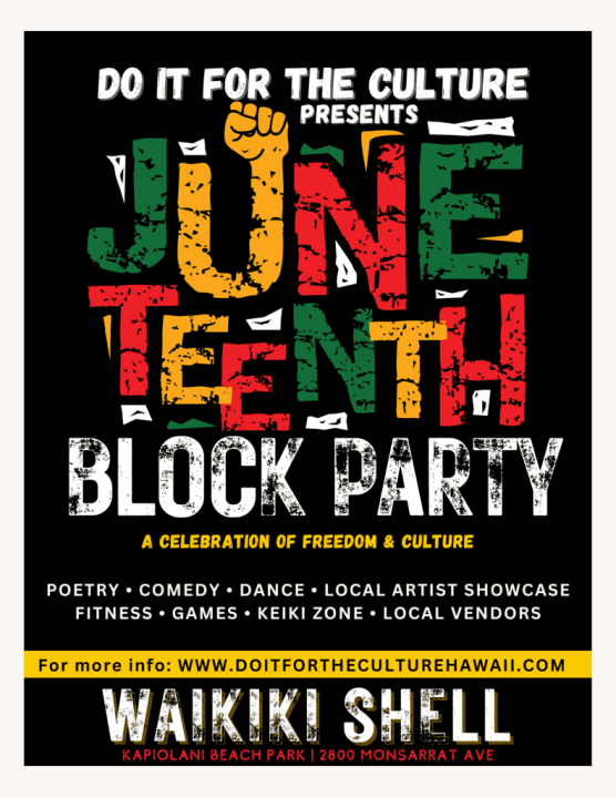 To celebrate this historic occasion, the organization Do It For The Culture Hawaii, is hosting a Juneteenth Block Party at the Tom Moffatt Waikiki Shell from 2 p.m. to 8 p.m.