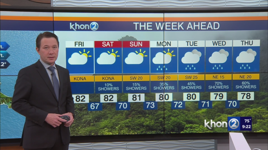 HONOLULU (KHON2) — The trades winds are being replaced as kona winds take over. By Sunday through much of next week, southwesterly winds will strengthen. A weakending cold front is expected to increase rain chances across the board. Wetter conditions will last much of next week.