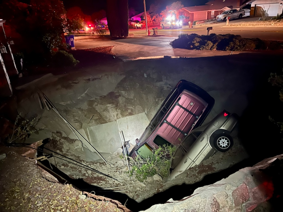 EL PASO, Texas (KTSM) — A large sinkhole engulfed two cars and temporarily displaced people from three homes in Las Cruces on Monday night, May 6, according to the Las Cruces Fire Department.