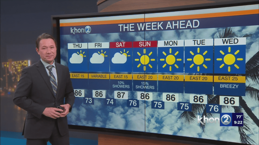 HONOLULU (KHON2) — Trade winds will weaken through Friday, then gradually increase over the weekend, reaching breezy levels by early next week. Limited low clouds and showers mainly in windward and mauka areas, but on Friday a plume of moisture could bring some additional clouds and showers Friday night into Saturday.