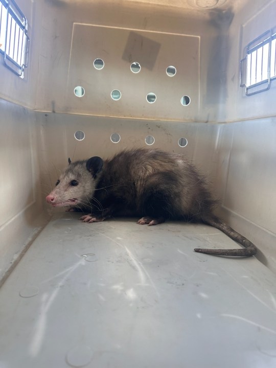 An opossum is seen in a kennel after it was caught in downtown Honolulu on July 17, 2024. (Courtesy HDOA)