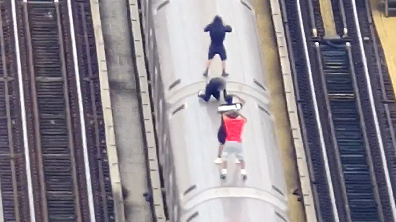 Footage released by the NYPD first shows one of the boys climbing onto the roof of the train and immediately crouching as it passes under the Westchester Avenue Bridge. The three other boys then emerge from between the train cars and get to their feet. One of the kids slips after standing up.