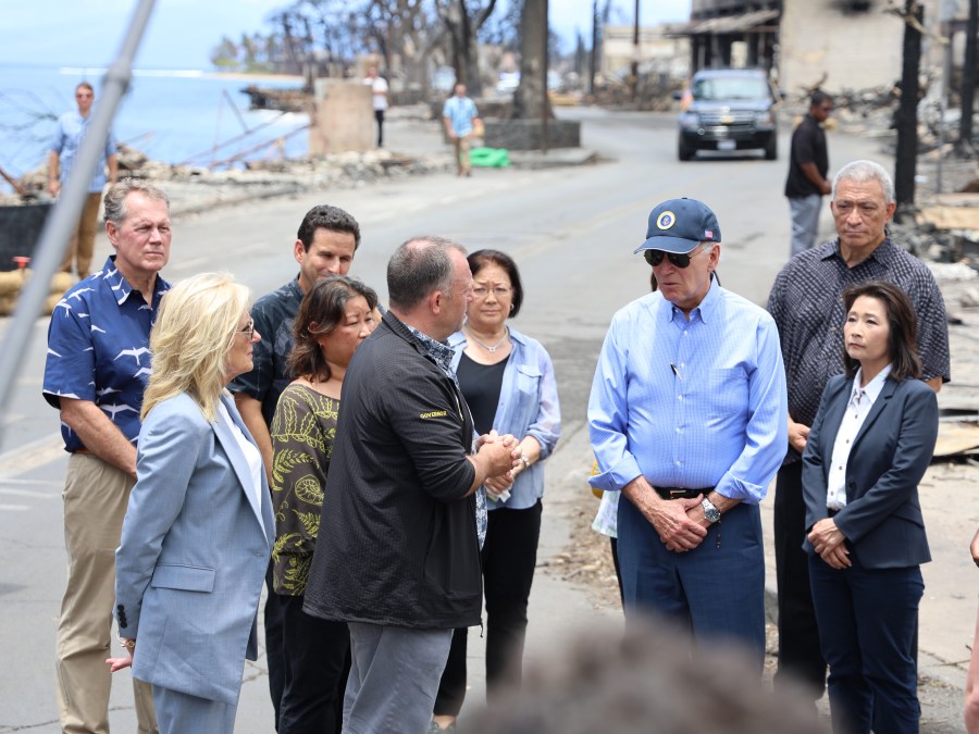 Rep. Ed Case, Dr. Jill Biden, Sen. Brian Schatz, First Lady Jaime Green, Gov. Josh Green, Sen. Mazie Hirono, President Biden, Maui Mayor Bissen and LG Sylvia Luke visit Lahaina on Aug. 21, 2023.