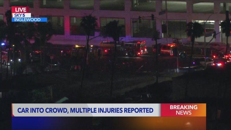 INGLEWOOD, Calif. (KTLA) — A vehicle allegedly plowed into a crowd near SoFi Stadium and the Intuit Dome in Inglewood, California, on Saturday night, injuring at least six pedestrians, according to officials.