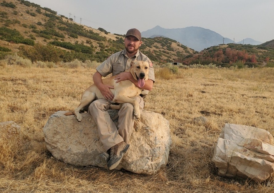 Conservation officer James Thomas sits with his K-9, Kip. (credit: Utah Division of Wildlife Resources)