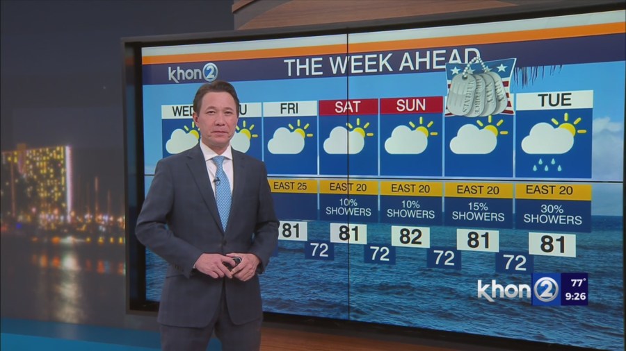 HONOLULU (KHON2) — Breezy trade winds will continue over the Kauai and Oahu, while lighter east winds cover Maui County and Hawaii Island through Wednesday. Showers will mainly fall over windward and mauka overnight and in the morning, with some showers developing in the interior and leeward sections of Oahu and Kauai on Wednesday afternoon and evening. Statewide, moderate to breezy easterly trade winds will return Wednesday night into Thursday and persist through early next week, with showers favoring typical windward and mountain areas of the state.