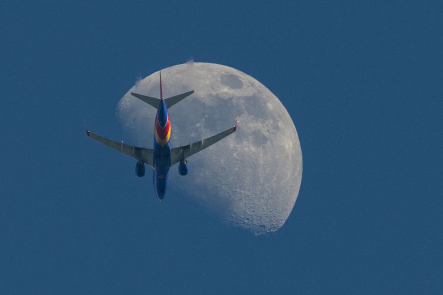 THOUSAND OAKS, CALIFORNIA – JUNE 15: A waxing gibbous moon rises as a Southwest Airlines Boeing 737 approaches Los Angeles International Airport from San Francisco on June 15, 2024 in Thousand Oaks, California. (Photo by Kevin Carter/Getty Images)