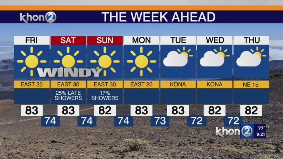 ...RED FLAG WARNING IN EFFECT FROM 10 AM TO 6 PM HST FRIDAY FOR WIND AND LOW RELATIVE HUMIDITY FOR LEEWARD AREAS... The National Weather Service in Honolulu has issued a Red Flag Warning for wind and low relative humidity, which is in effect from 10 AM to 6 PM HST Friday. The Fire Weather Watch is no longer in effect. * AFFECTED AREA...Leeward portions of all Hawaiian Islands. * TIMING...From 10 AM to 6 PM HST Friday. * WINDS...East 20 to 30 mph with gusts up to 45 mph. * RELATIVE HUMIDITY...As low as 40 to 45 percent. * IMPACTS...A combination of strong winds, low relative humidity, and dry fuels can contribute to extreme fire behavior. Any fires that develop will likely spread rapidly. A Red Flag Warning does not predict new fire starts. PRECAUTIONARY/PREPAREDNESS ACTIONS... Outdoor burning is not recommended. Heat from vehicle exhaust systems can ignite dry grass. Park cars on areas that are paved or where vegetation is trimmed and cleared. High winds contribute to wildfire hazard. Delay activities that could throw off sparks until the wind dies down. A Red Flag Warning means that critical fire weather conditions are either occurring now or will shortly. A combination of strong winds, low relative humidity, and warm temperatures can contribute to extreme fire behavior. A Red Flag Warning does not predict new fire starts.