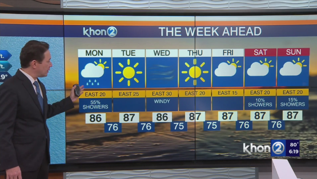 HONOLULU (KHON2) — Partly cloudy conditions across most areas right now thanks to high pressure and trades. A narrow band of moisture stretches southeast from just east of Windward Big Island. This moisture will move toward Maui tonight, reach Oahu early tomorrow, and arrive at Kauai by midday Monday. Expect a slight increase in clouds and light showers on the windward side, with a few light showers possibly reaching leeward areas. Breezy trades will gradually fill in after the trough passes, but they will decrease this weekend, especially in the western part of the state.