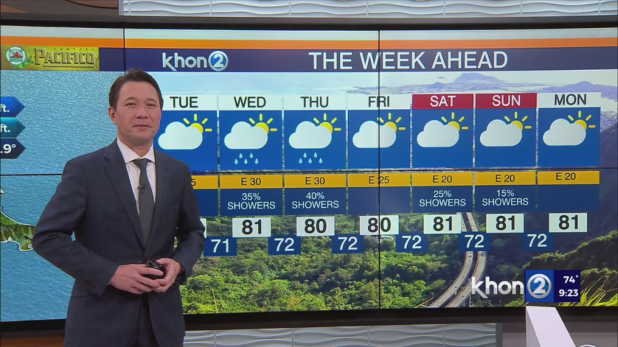 HONOLULU (KHON2) — Breezy and showery trade winds are expected for the week, favoring windward and mauka locations with clouds and showers. The trade winds might weaken a bit over the weekend as the high to the north weakens.