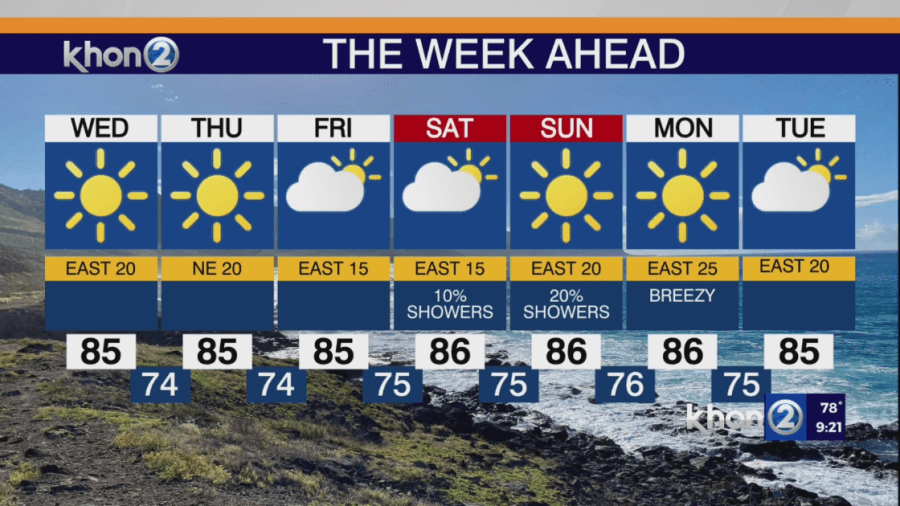 HONOLULU (KHON2) — Today, breezy trade winds are blowing across the islands due to a strong high pressure system to the north. The atmosphere remains stable and relatively dry. Some scattered clouds can be seen in windward and mauka areas although overall moisture levels are low, especially in the eastern part of the state.
