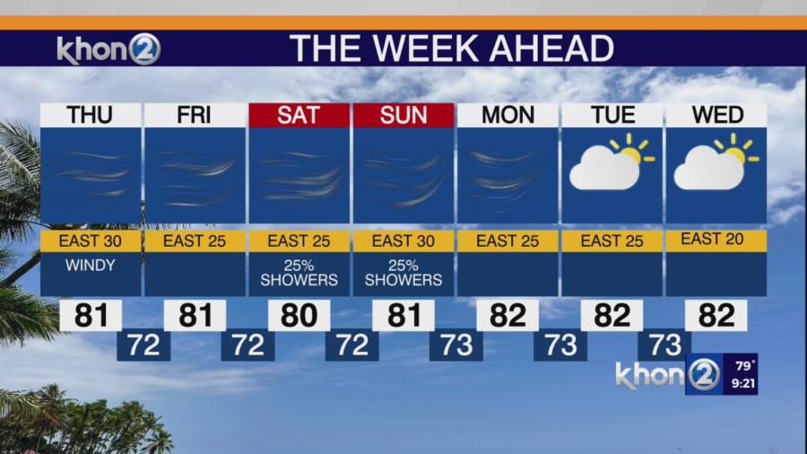 HONOLULU (KHON2) — A low pressure system west of Hawaii, combined with high pressure far to the northeast, has resulted in moderate to breezy trade winds. Tthe high pressure to our northeast will strengthen slightly and drift south-southeast as the low to our west slowly moves northward. This will cause a minor increase in wind speeds into the weekend. The low will dissipate through the weekend, and the high pressure northeast of the state will move slightly southwest, closer to the islands early to mid next week, providing another small boost to trade winds in early June.