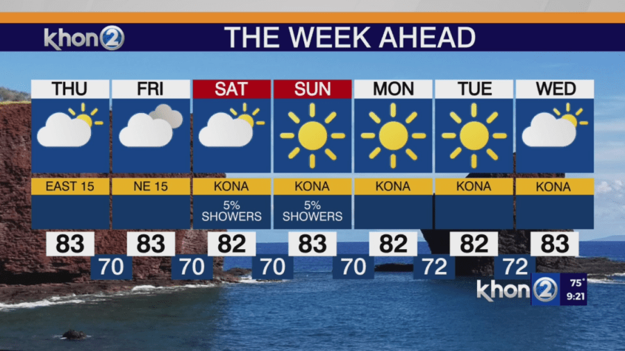 • Thursday: Trade winds will weaken, and windward Big Island showers will decrease.