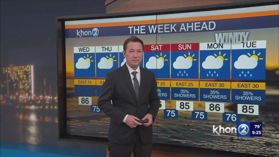 HONOLULU (KHON2) — A front is currently about 350 miles north of Honolulu, with a weak high between the front and the islands. This is leading to light to moderate trade winds across the island chain this evening. Mostly cloudy skies with low clouds moving in with the trades and high clouds overhead. Radar shows scattered showers affecting windward areas of Oahu and the Big Island, while Kauai and Maui County are seeing fewer showers right now.