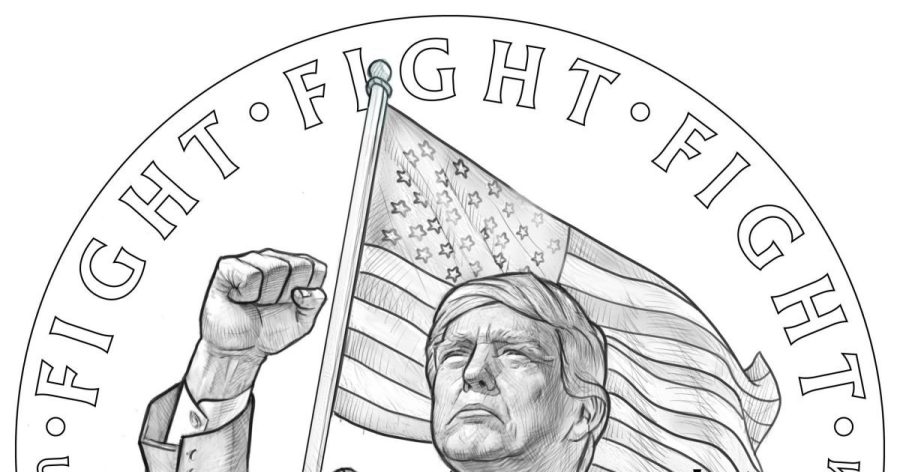 His fist is raised and depicted beside the words “Fight, Fight, Fight,” a term vocalized by Trump shouted after he survived an assassination attempt at his July 2024 campaign rally.