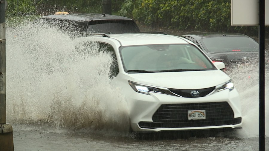 Saturday’s bursts of heavy rain had people wading through flooded streets in Waikiki.