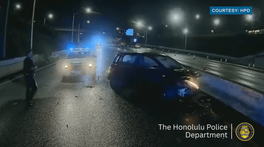 HONOLULU (KHON2) — The Honolulu Police Department is urging the public to be cautious on the road after a vehicle slammed into a police vehicle during the early morning hours of July 10.