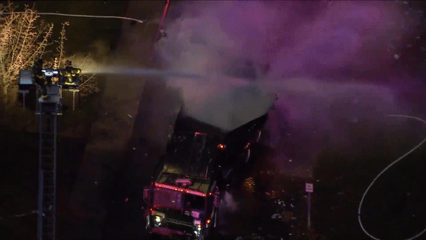 SkyCam 9 was over the scene around 5 p.m. when two ladder trucks could be seen spraying water on the badly damaged truck.