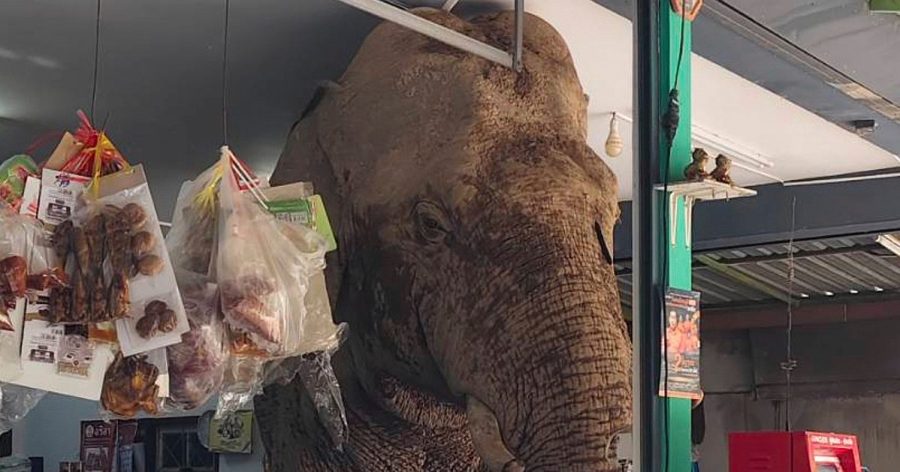 Videos of the incident showed the huge male elephant, known as Plai Biang Lek, briefly stopping in front of the shop, located next to a main road near the Khao Yai National Park in northeastern Thailand, before ducking his whole body inside.