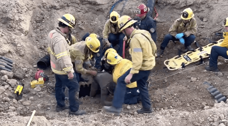 (KTLA) – A harrowing rescue unfolded amid sweltering temperatures as first responders in Ventura County, California, worked to free a man from a 36-inch drainpipe Sunday.