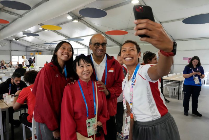 Tharman Shanmugaratnam, the President of the Republic of Singapore, poses for a selfie as he meets Singapore’s athletes during his visit to the Olympic Village at the 2024 Summer Olympics on July 24, 2024, in Paris, France. (Michel Euler – Pool/Getty Images)
