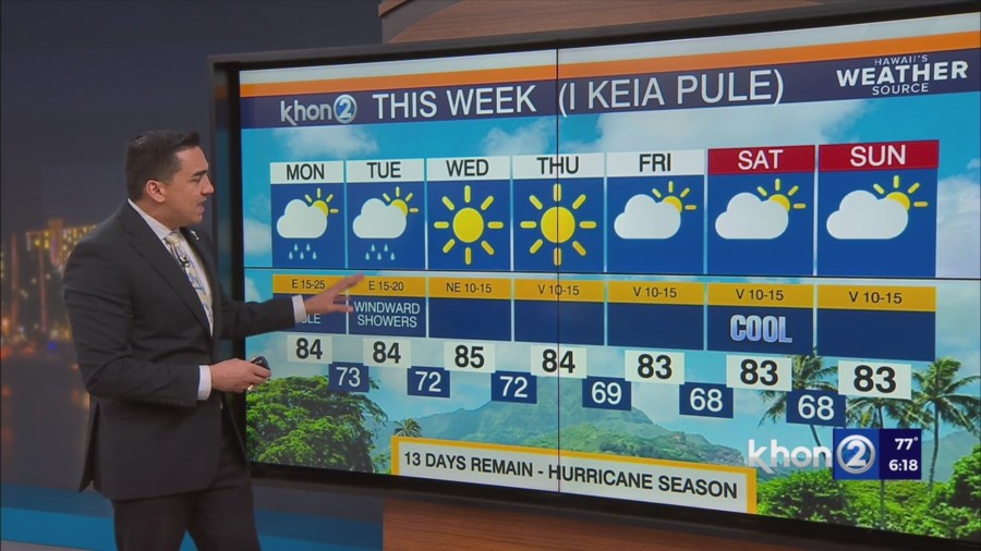 HONOLULU (KHON2) – Models show the high north of the state will shift southeastward and gradually weaken, with trades easing to breezy levels on Monday.