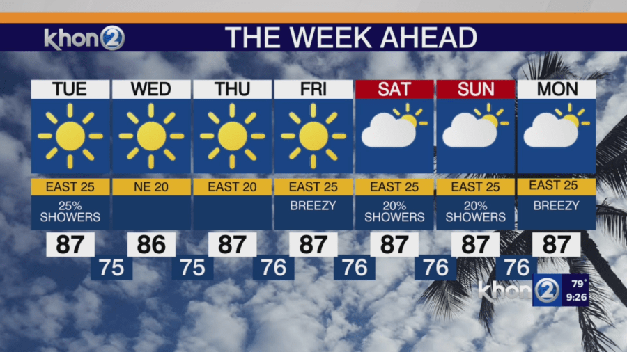 HONOLULU (KHON2) — The stable cloud cover upstream is breaking apart, and as a result, cloud clusters are encountering a slightly less stable environment over the islands. This has led to a slight increase in trade wind showers over the past 12 hours. The stable clouds approaching Hawaii will become thicker, leading to more widespread showers and increased rainfall in windward and mauka areas this week. Some light rain may also reach leeward areas, especially overnight.